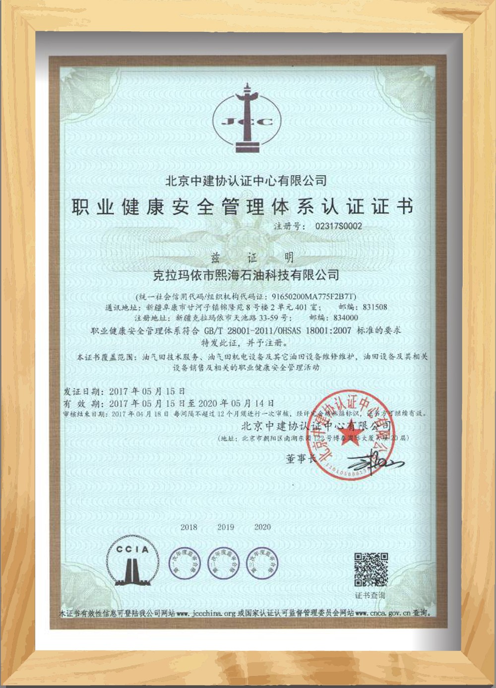 職業(yè)健康安全管理體系認證證書